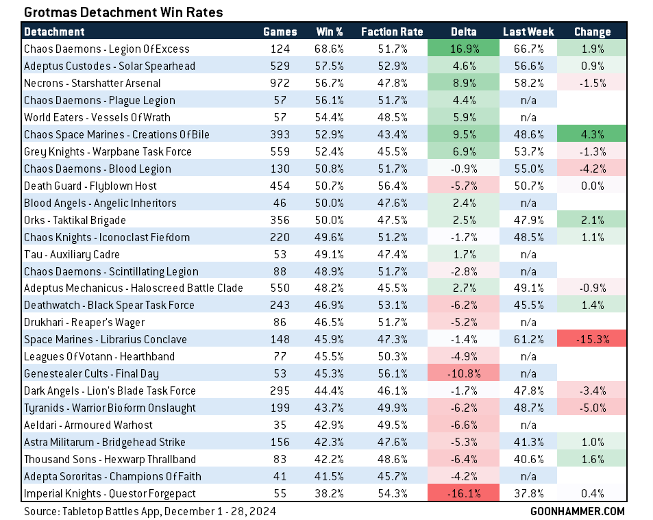 We're now comfortably sitting on more than 30 games played for every Detachment save Space Wolves, which launched on Christmas Eve (and in addition to that has a core mechanic that players are likely to have difficulty evaluating). The standard caveats apply here again - we're still looking at a lot of practice games and we haven't seen nearly enough games yet for most of these to come to concrete conclusions, but we are definitely starting to see solid results which give us some good directional data. In the chart below we'll be looking at both the Detachment Win rates, a comparison to the win rates for the same faction with every other detachment (or in the case of Daemons, just the Daemonic Incursion Detachment for all four monogod versions), and a look at how this year's number compares to last week, where there's enough data for a meaningful result.