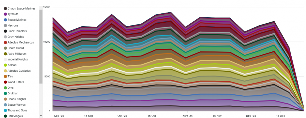 Last time around we looked at the early impact of Grotmas detachments using data collected from the Tabletop Battles App. Since December 1st, we've seen 18,457 games recorded in the Tabletop Battles App, which is down a bit from what we were seeing in October and November but that's to be expected with Christmas causing a large dip in events and games, generally.