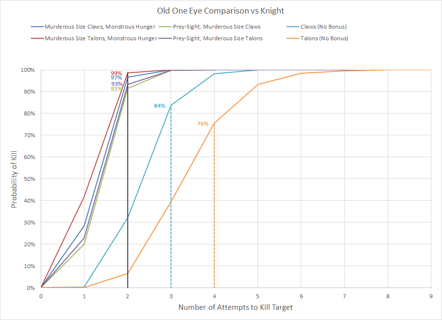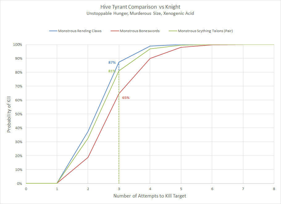Prey-Sight would result in a +3 bonus to hit and potentially trigger extra attacks on a hit roll of 3+. As you can see in the chart above every approach provides a massive benefit over the baseline model. Given the choice I would probably apply Murderous Size to the claws, as the benefits are nearly equivalent to the talons option but do not require a power to go off.