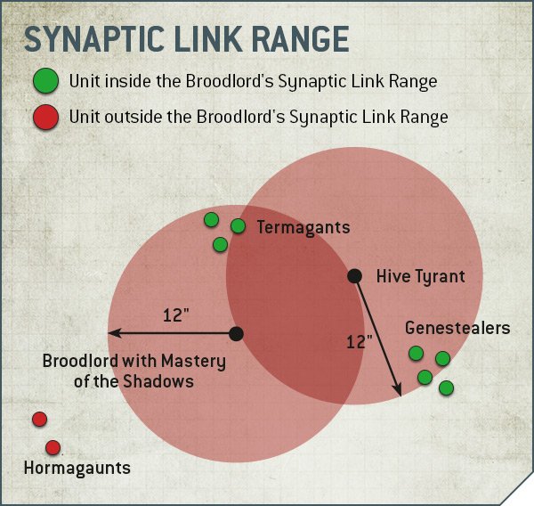 Synaptic Link for between 10 to 15 points, which allows them to apply a boost to an applicable unit within Synaptic Link Range during the Command Phase. One would think that Synaptic Link range would be equal to a model's Synapse range, but it does not. Instead the effect is a flat 12", with the added effect that you can bridge the ability across other SYNAPSE creatures so long the distance of every link is less than or equal to 12".