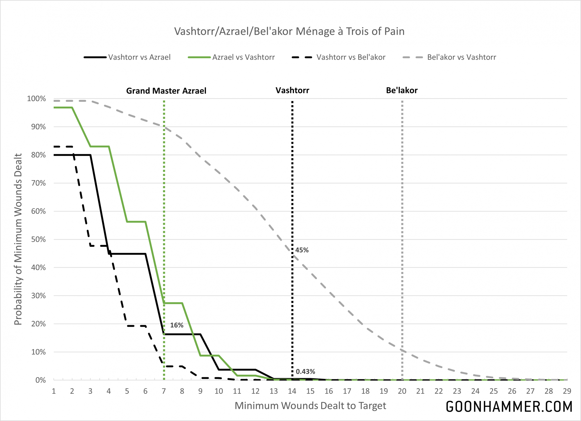 Turns out Vashtorr isn't completely useless and will one shot the Grand Master 16% of the time thanks to his multiple attacks. Azrael doesn't have much of a chance in response and has a roughly 1 in 200 chance of killing Vashtorr on the charge, although that probability goes up to 1.91% if he shoots his overcharged plasma gun a couple of times first. Meanwhile Be'lakor shows why he's over a hundred points more and will absolutely punk Vashtorr 45% of the time (ignoring invulnerable saves tends to do that), while in response the best Vashtorr can do to the Lord of Shadows is annoy him.