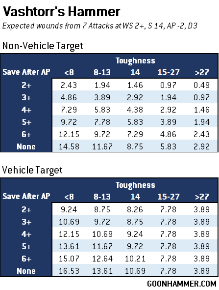 Repulsor Executioner), you get a T7 character who cannot be hidden thanks to his 14 wounds and is only protected by a 2+/4++ save profile and a single point of damage reduction. Offensively he has two options, neither of which are particularly inspirational. The first, Vashtorr's hammer (that's the actual name of the weapon, and it's not even a proper noun), gets between 5 and 7 attacks (Vashtorr's profile degrades) at WS 2+, S14, AP -2, and deals 3 damage. Should you roll an unmodified 5+ to wound against a VEHICLE target the hammer deals 4 mortal wounds and the sequence ends. His other option, Vashtorr's claw, is a 12" flamer with D6 shots that hits at S5, AP -2, and a single point of damage. That's it. The claw doesn't even hit in melee. It's the daemonic equivalent of a fantasy sword named "Reaper's Bane" bought at a mall.