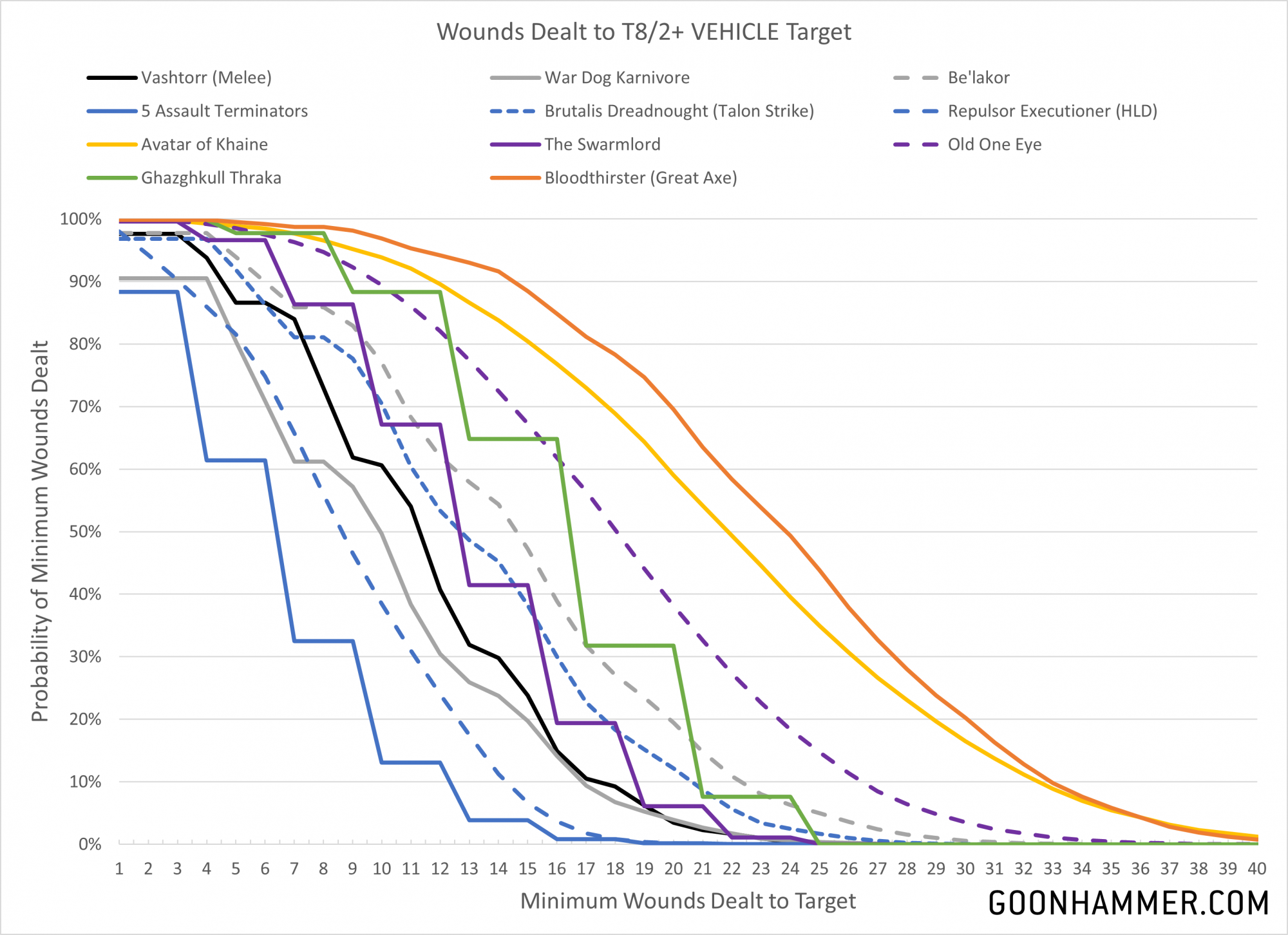 I put together a comparison of Vashtorr against a variety of other things that might be inclined to take on a typical T8/2+ VEHICLE target. His melee output is roughly equivalent to a War Dog Karnivore, which would be fine except that the War Dog is over a hundred points cheaper. Against melee oriented units that are roughly in his price range such as The Swarmlord or Old One Eye there's no real comparison, let alone when put up against the Avatar of Khaine.