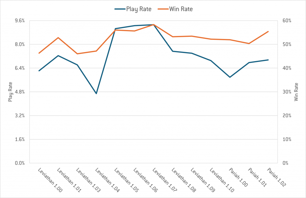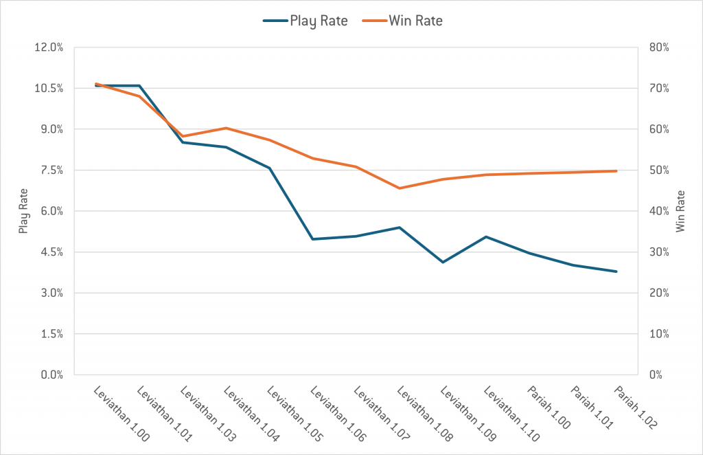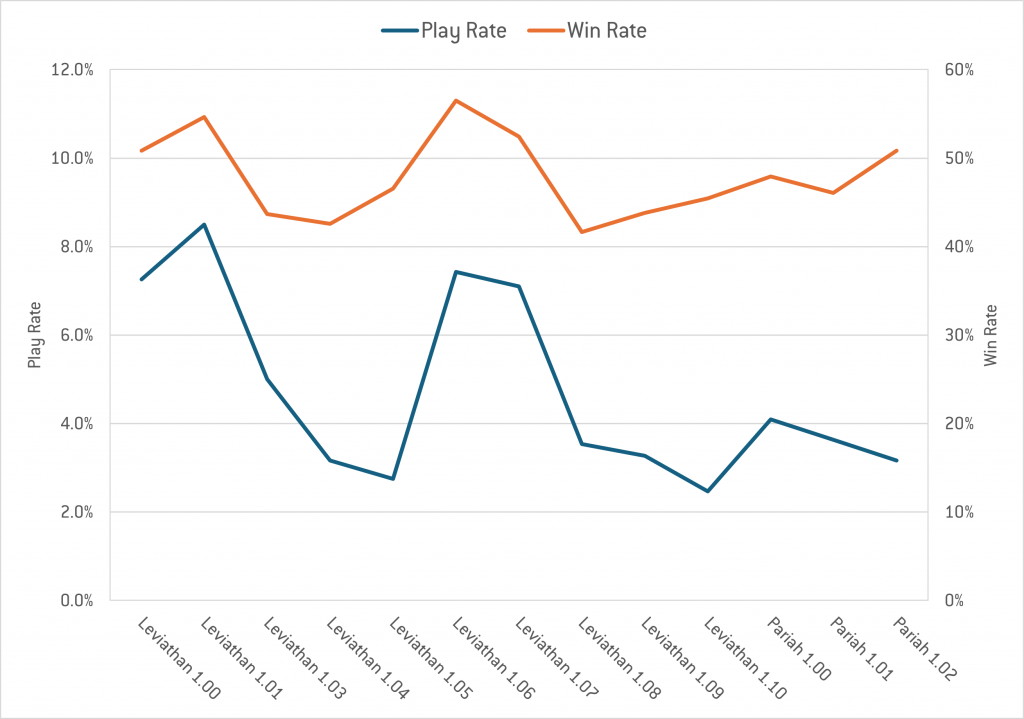 Aeldari started out very hot (read: Broken) out of the gates in 10th edition. Across the first two metas they sustained a win rate close to 70% while boasting a 10.5% play rate - more than one in every ten tournament players was fielding an Aeldari army during these first weeks. They were a dominant army with considerably over-tuned rules, abusing all of the most problematic rules of the early edition - Devastating Wounds, Overwatch, and Towering - while having a strong army mechanic to remove dice variance and a strong detachment rule backing up powerful datasheets. As the edition has gone on, this index has received substantial rewrites and nerfs, which were closely followed by both drops in win rates and in play rate. While their win rate has largely stabilized since Leviathan 1.08, their play rate continues to drop, dipping to what is considered a "normal" play rate of 3.9% (with 26 factions, a perfect distribution would have each faction being played by 3.8% of the meta).
