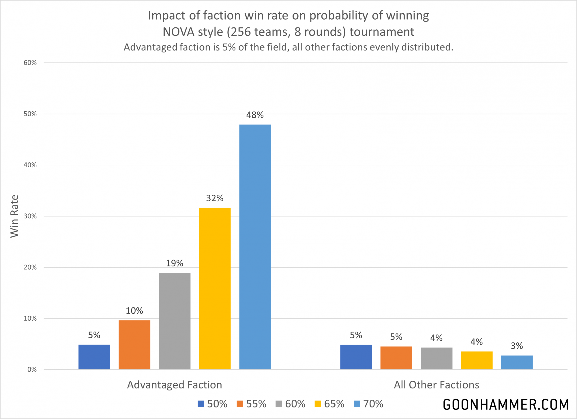 Things quickly skyrocket if the advantaged faction composes a larger portion of the field. At the 70% win rate level the advantaged faction has a whopping 69% chance of winning the event even though it only makes up 10% of the field. In reality the advantaged faction (or factions) is likely to dominate the field and see even more players flock to them as the meta shifts.