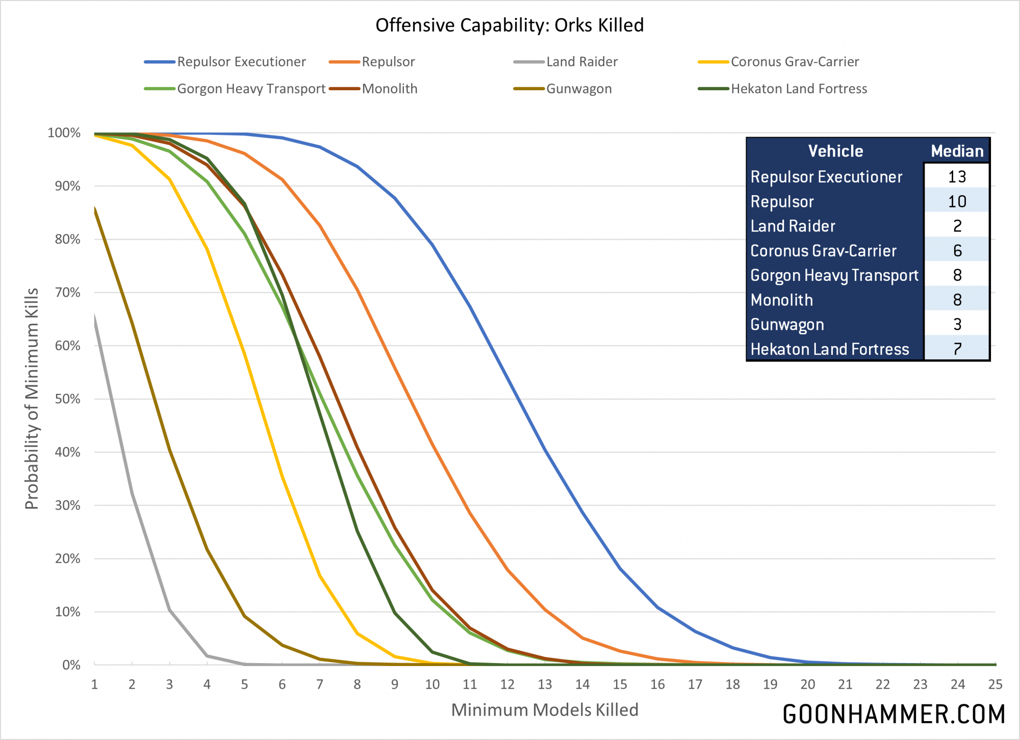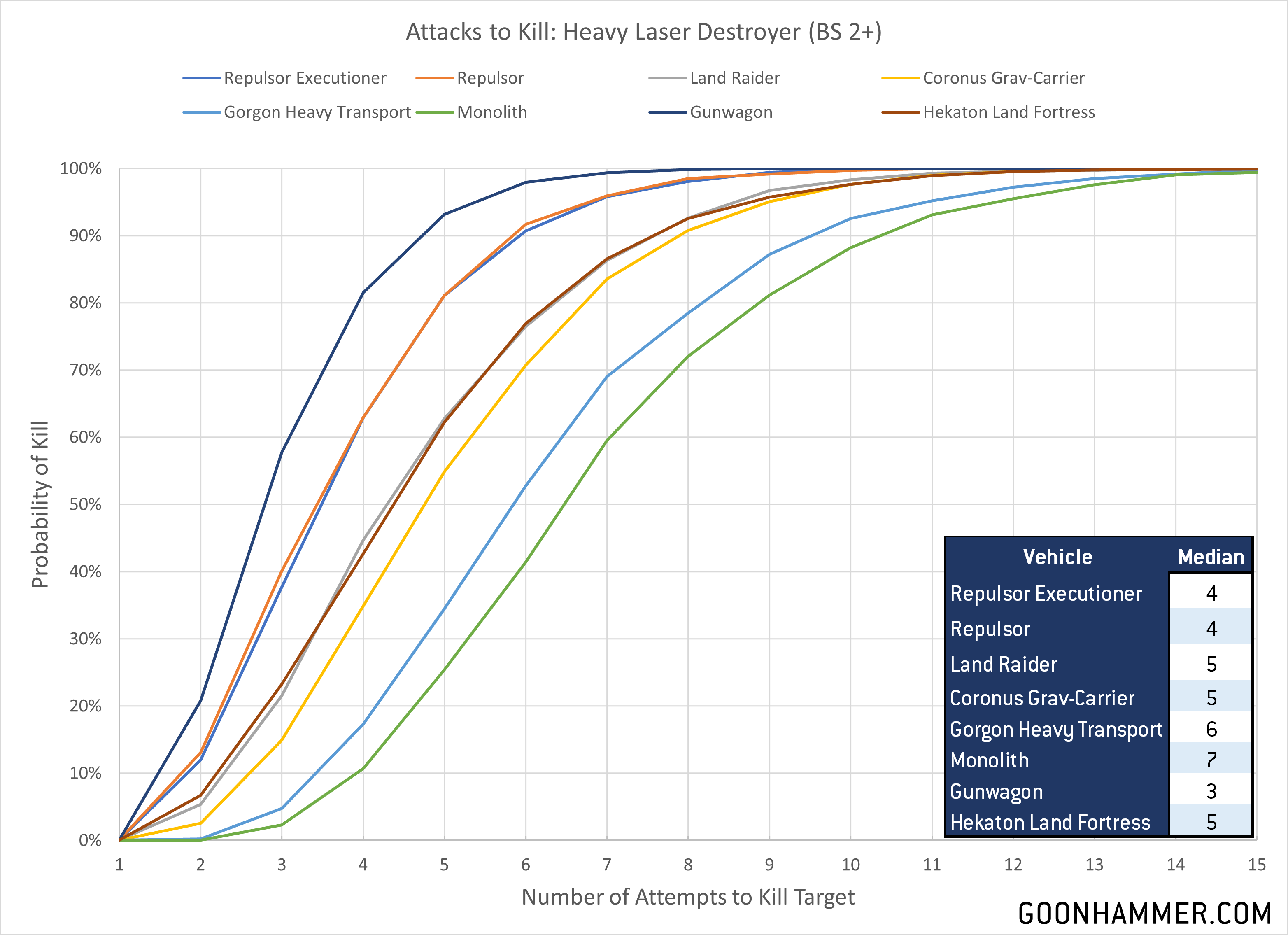 The heavy laser destroyer's additional damage makes it a nasty weapon at range, but in contrast to 300 points worth of Eradicators we see that the RepEx is far less effective at killing heavy targets. Even a battlewagon requires a median of 3 attacks to kill it, while something like a Monolith would likely survive two turns of three RepExes firing their main guns at the Necron vehicle. Once again we see that the RepEx is only slightly more survivable than the battlewagon and more vulnerable than all of the other options.