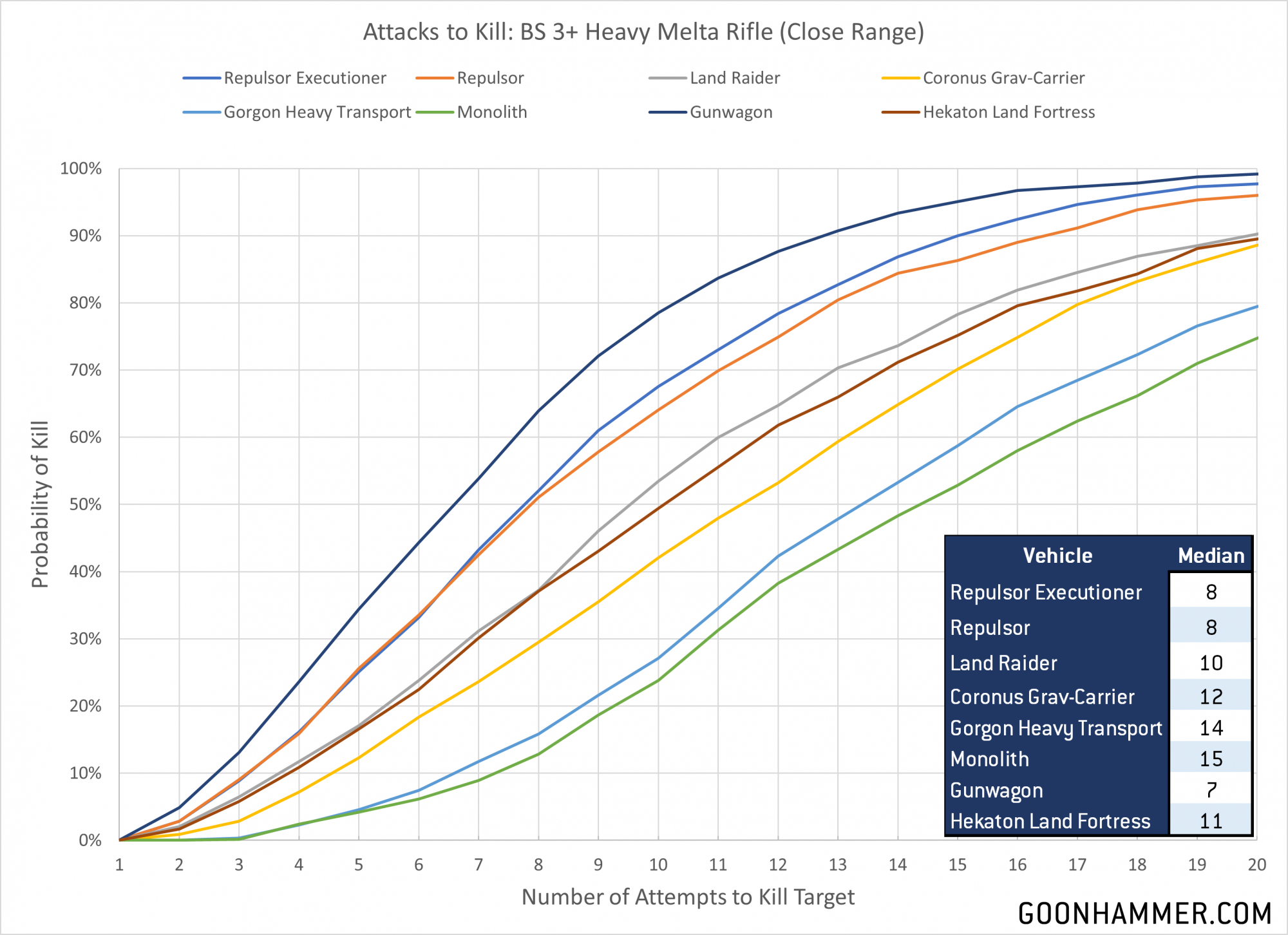 The first thing we can examine is the ability of these vehicles to take a hit. To examine the resilience we look at how many attacks it takes for three weapons to kill the target. The first weapon is the heavy melta rifle at close range. The second is the main weapon of the Repulsor Executioner itself; the heavy laser destroyer. From the Astartes perspective this weapon is the pinnacle of ranged anti-tank firepower. Finally we have the undisputed champion of long range destruction; the T'au railgun on a Hammerhead. For these runs I did 10,000 simulated attacks and then summed up how many were required to achieve the desired number of wounds. The median value is the number of attacks that showed up in the center of the distribution, meaning you have as good as chance as not of killing the target when you use that many attacks.