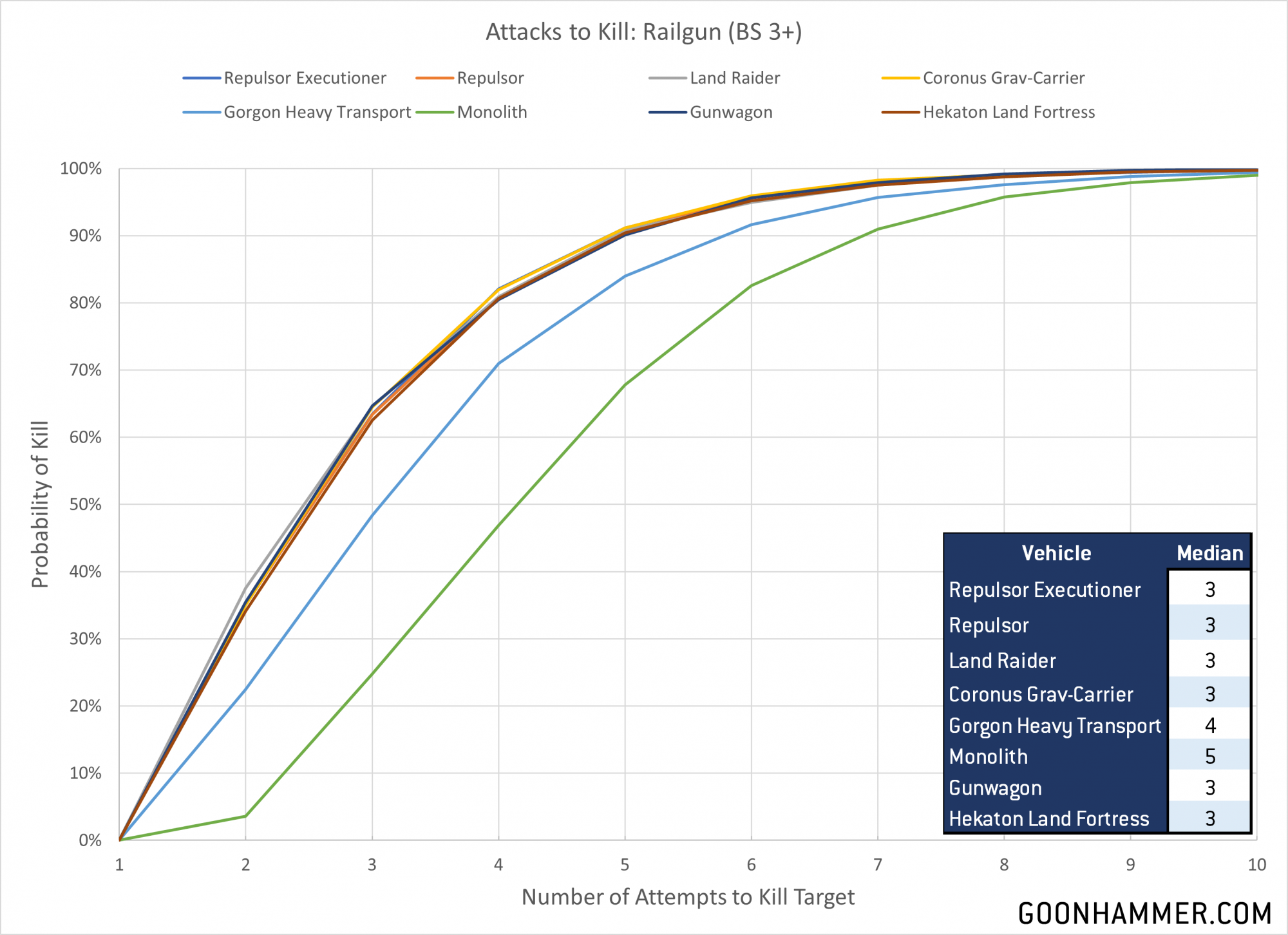 The railgun is pure brutality thanks to its combination of high strength, devastating armor penetration, ability to ignore invulnerable saves, and additional mortal wounds inflicted. Here we see the curve flatten out, with most vehicles dying to a median of three attacks while the Gorgon and Monolith require a few more thanks to their additional wounds. A pair of Hammerhead Gunships costs 290 points.