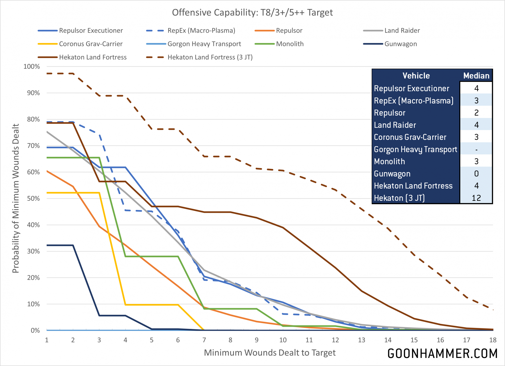 Here you see the key problem with the RepEx; it's just not that good at killing tough stuff. Then again none of the heavy transports really do much outside of the Hekaton Land Fortress firing the magna-rail cannon and MATR autocannon (especially with Judgement Tokens). The output of the RepEx is pretty close to that of the classic Land Raider, which makes sense given that the total damage between a heavy laser cannon and four lascannons is similar. The problem is that the humble lascannon just isn't very good in a game full of magna-rail cannons and railguns. Again, this is against the loyalist Land Raider and not the improved heretical one, which would cost around 265 points and fire four soulshatter lascannon shots. Incidentally those shots do a median of 6 points of damage, making the Chaos Land Raider the most lethal option available. It's notable that the output of an overcharged macro-plasma incinerator is only slightly worse than the heavy laser destroyer; the RepEx has a median of 4 wounds to the plasma's 3 but the curves are pretty similar.
