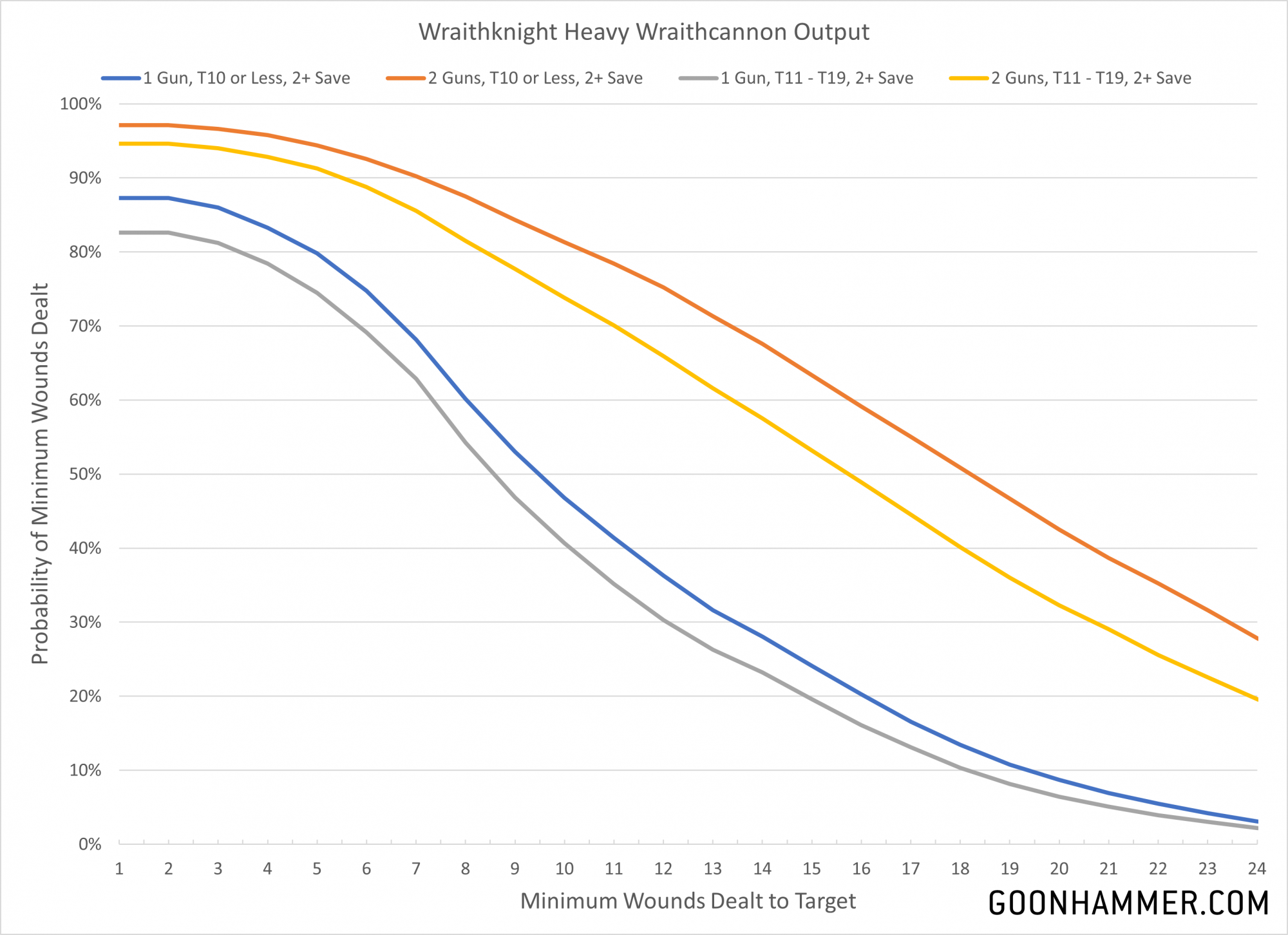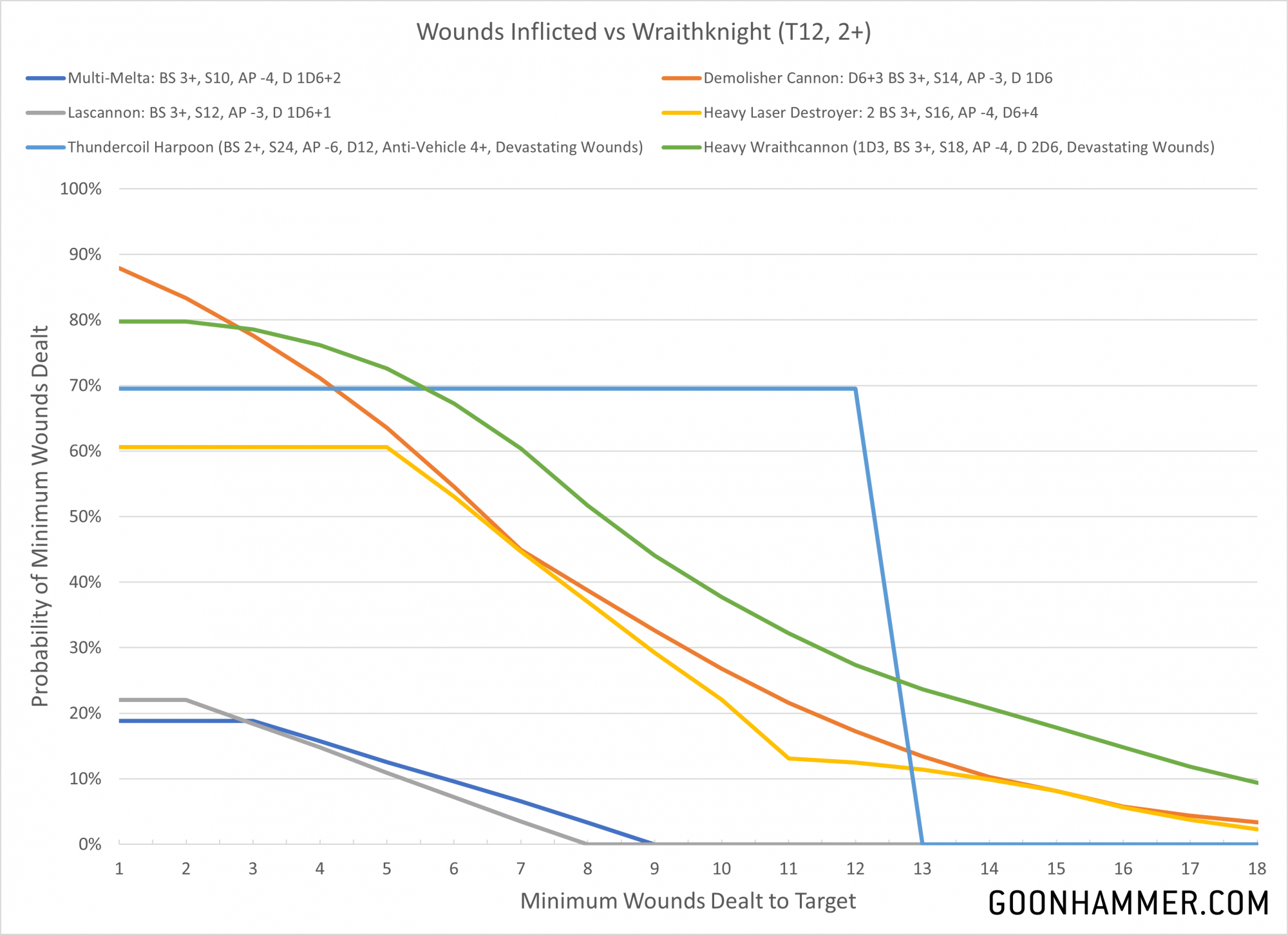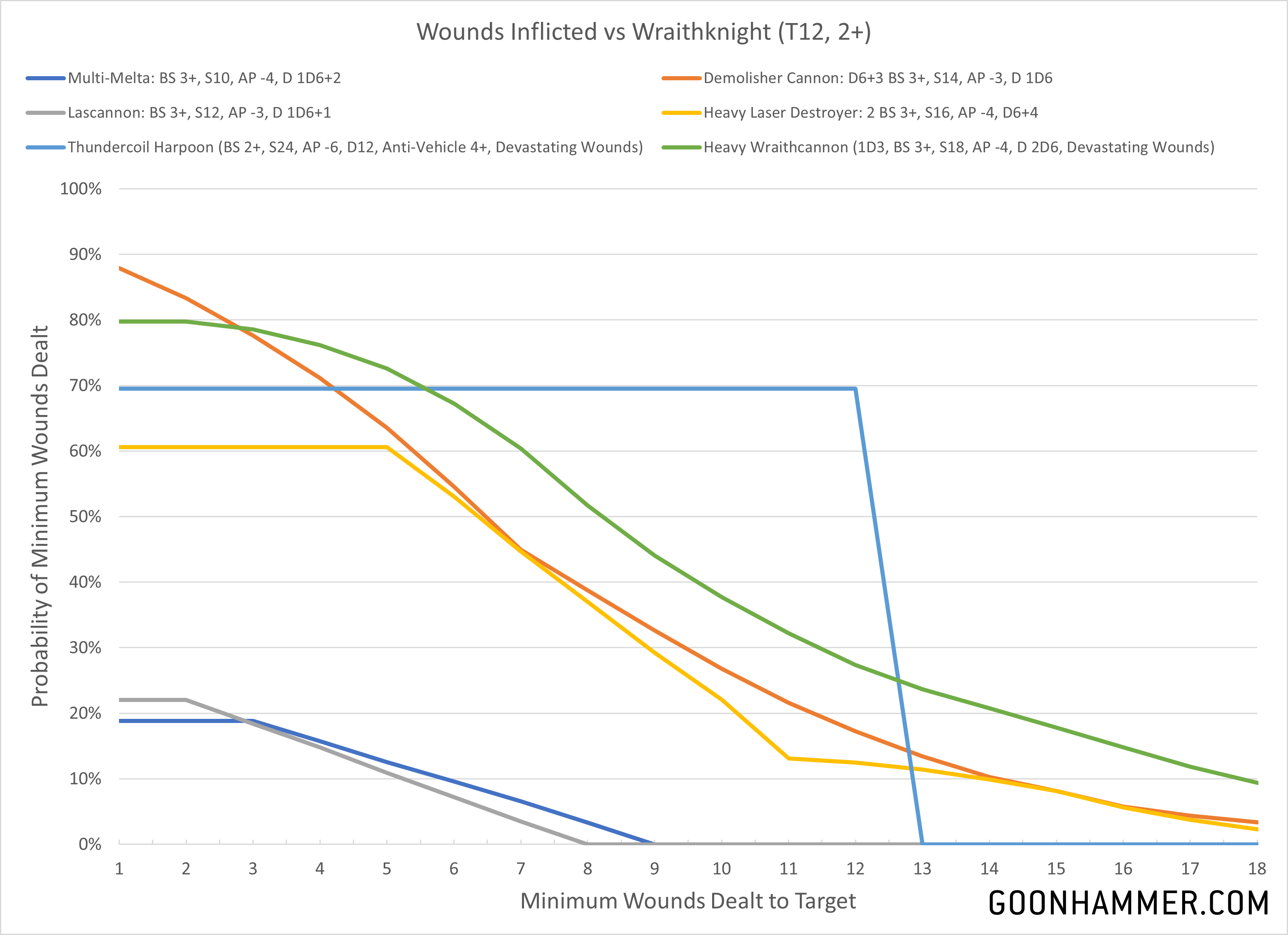Naturally if you see enough of these things on the table, you're going to want to kill them. So what kind of damage can you reliably expect to inflict on an 18-wound monstrosity with T12 and a 2+ save? Well the answer is... not much. Single-shot weapons like the lascannon and multi-melta suffer from having a poor chance to wound or get past the 2+ armor save. The demolisher cannon remains a reliable threat, especially since the multiple shots means that Strands of Fate will have less of an impact. Both the demolisher and heavy laser destroyer on the RepEx have a 5% chance of dealing enough damage, but heavy wraithcannon remains the superior choice.