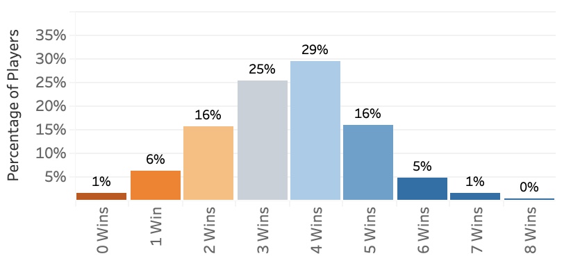 Compare this with the results for Index: Aeldari’s players - 3 and 4 win records are the most common, with 4 wins being the modal record across the player population.