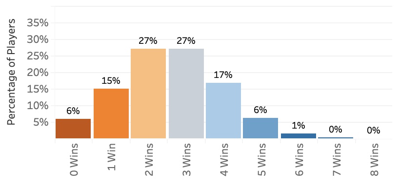 First, the Event Record Distribution. Two and Three win records should be most common in the aggregate and for balanced factions. As seen here: