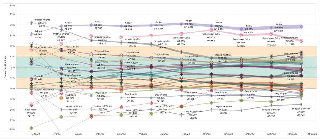 …we can see that Aeldari took the Win Rate lead on Week 2 of 10th Edition’s release, and have held on to the top spot ever since. It’s safe to say that they’ll maintain the lead over Labor Day weekend. making them second only to the 9th Edtion’s Tyranids release 12 straight weeks atop the Nachmund meta.
