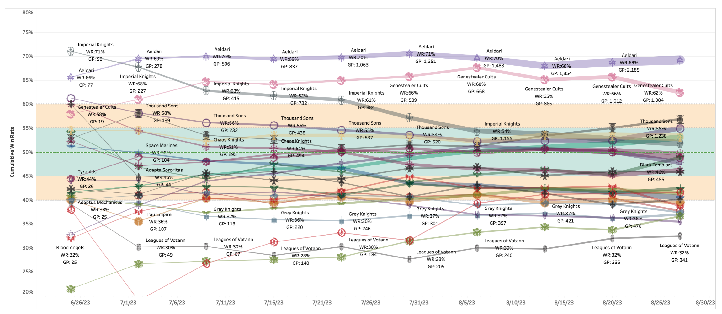 - Player Population: This is the percentage of the overall GT+ player population that has played a given faction. This is a great stat for providing context to our data, as generally, the larger the pool of players running a faction, the more likely its performance will trend toward the mean.