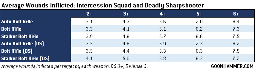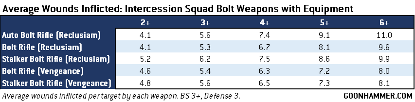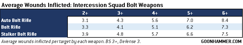 Kill Team is a lot of fun and I recommend you give it a shot if you haven't already. This article just shows a hint of how much depth many options have, and this doesn't even include the influences of Cover or melee. In terms of bolt weapons, it seems like the auto bolt rifle is particularly nasty against anything less armored than a Space Marine. Depending on the Chapter Tactics or Equipment selected it can be made even better, although doing so means making sacrifices in terms of durability or other weapons.