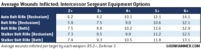 Reclusiam-blessed Bolts, it makes sense to investigate what happens when a BS 2+ Sergeant gets different equipment combinations. The chart above shows the results; with just the bolts the auto bolt rifle holds its own against the bolt rifle and stalker bolt rifle when they are equipped with both the bolts and the scope against saves of 4+ or better. Against the 2+ and 3+ saves a fully equipped stalker bolt rifle does average more damage, but the regular bolt rifle isn't far behind.