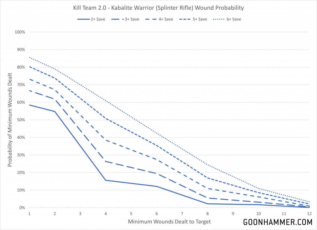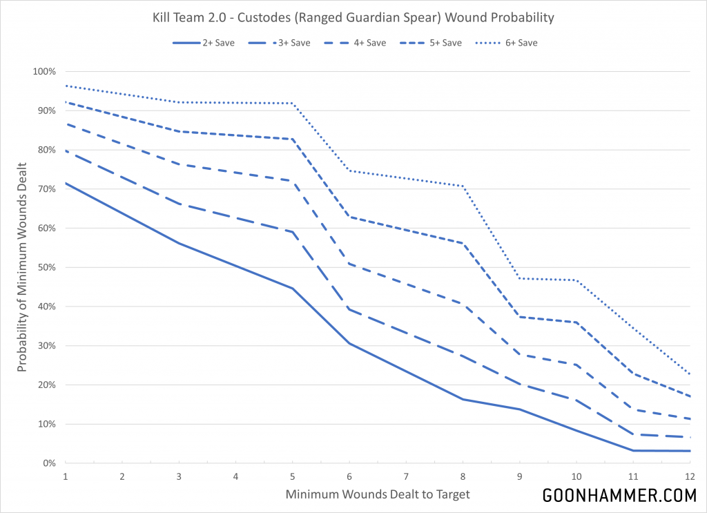 Lethal 5+ ability of their melee weapons. The curves above also show why armies like Drukhari have such a tough time. A Custodes will kill a Kabalite Warrior in one shot 40% of the time, but a Commorrite Kill team only consists of 10 models. There's just not enough bodies to survive.