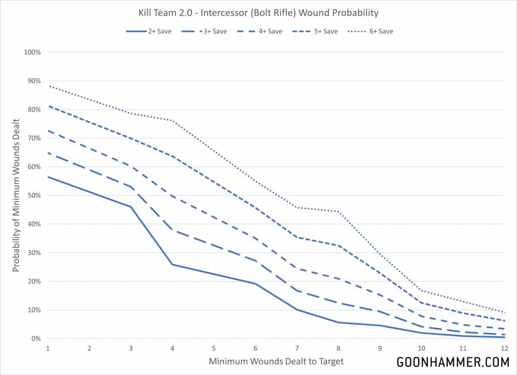 attack sequence article and expanded it so that it would include things like mortal wounds, AP, and would also calculate the profile against a variety of saves. One of the things that separates Kill Team from 40k or other skirmish games like Necromunda is that the attack sequence is truncated to a comparing successes on offense against successes on defense. Where 40k or Necromunda require a hit/wound/save sequence, in Kill Team only two rolls are made. Since every unit in Kill Team (save one) has a Defence value of three, the attack outcomes generally fit a series of well defined curves.