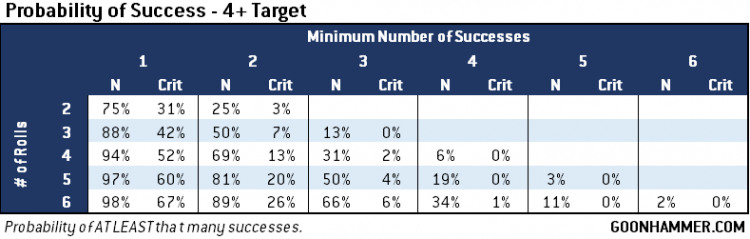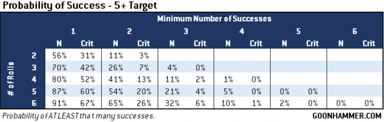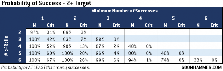 To use these charts, start with the target value chart that applies to your success number (WS, BS, or Save) and then look at how many rolls you'll get on the left. Then go across the row to find the probability that you'll get at least that many successes and critical successes. For example, a Custodian Guard with a 2+ save and a Defence value of 3 has an 87% chance of getting 3 successes, and there's a 42% chance that at least one of those rolls will be a critical. Using a Guardian Spear that same Custodian Guard's 5 attacks with a 2+ to hit translate to a 40% chance that every attack will hit at 5 damage each. You can also use the chart to examine the effect of the