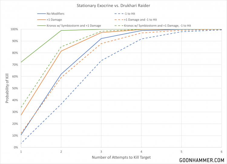 Pathogenic Slime for 2CP it's useful against a variety of threats. Kronos is particularly useful with re-rolling hit rolls of 1 when the unit doesn't move and the Symbiostorm power which generates an additional hit on a hit roll of 6+. Because the Tyranid book is old GW hasn't yet updated the effective to be unmodified rolls of 6, so the immobile Exocrine will get the additional hit on a 5+ assuming the Drukhari player doesn't force a penalty to the Hit roll. You're looking at around 2-3 attempts to achieve the 95% threshold, but in general the sheer number of shots and high damage make these units particularly ideal for taking out Raiders.