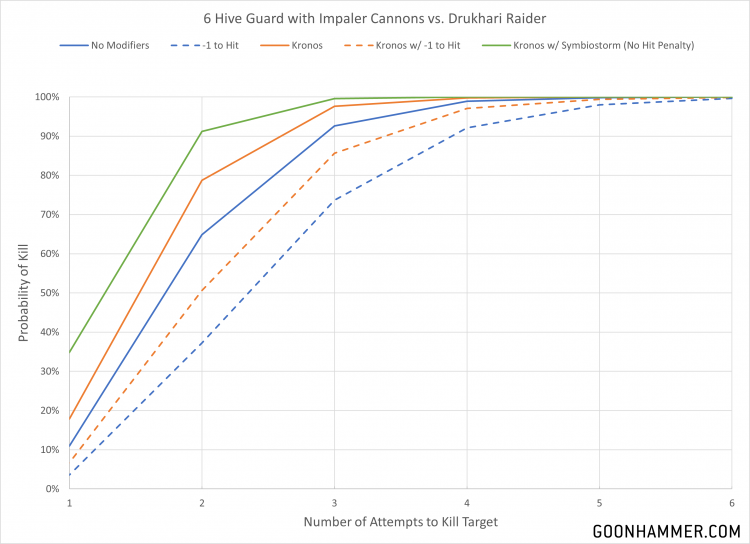 Single-Minded Annihilation for 2CP which allows the unit to fire a second time. A unit of six with Impaler Cannons is 270 points. As with the Exocrine the Hive Guard perform very well, dealing a lot of damage and having a solid chance of killing the Raider in a single turn when
