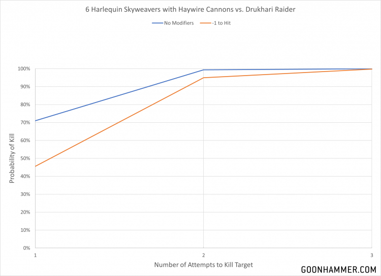Fast, lethal, and able to unleash a massive amount of damage, Harlequin Skyweavers are absolutely brutal when attacking VEHICLES with haywire cannons. Each model gets D6 S4, AP-1, D1 shots which hit on a 3+ and will wound VEHICLES on a 4+ and are guaranteed to cause a mortal wound (or D3 mortal wounds on a wound roll of 6+). This bypasses the invuln save of the Raider and makes them incredibly nasty at 300 points for six. Those points will give you a massive ability to deal damage, with the Skyweavers killing the Raider in one turn 45% of the time even with a -1 Hit roll penalty.