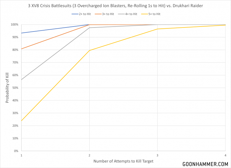 Velocity Tracker to add +1 to hit when targeting a fly unit. For this analysis we'll look at a range of hit rolls; 2+ to 5+, and assume that the target is re-rolling 1s to hit. We see below that even three battlesuits have a VERY good chance of taking out the target, thanks to the combination of re-rolls, high strength, and high damage.