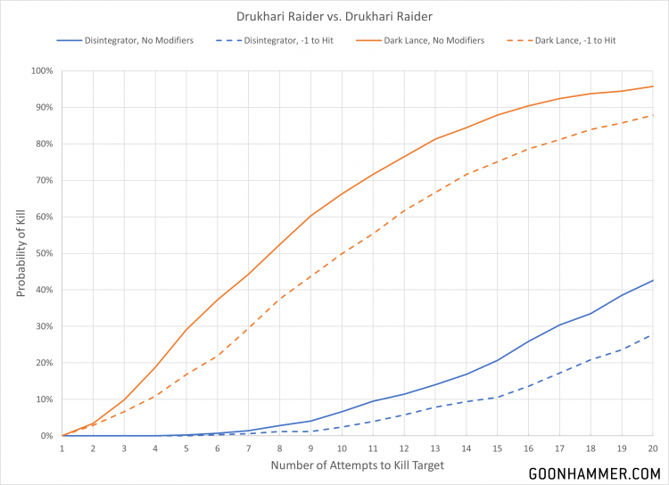 One of the most difficult aspects of analyzing a game like Warhammer 40,000 is establishing an idea of what a good metric is. This is particularly true when considering points efficiency. What makes a good sample set for determining how effective something is at killing or being killed? What exactly is "good enough" in the context of probability? The most common value used is the average result, but that doesn't take into account variability. By that metric a weapon which deals 2D6 damage is equal to a weapon that deals a flat 7 damage. One of the biggest criticisms we received from last week's article was the decision to select a 95% probability as the metric. It's perfectly understandable; that's a very high bar to achieve. We chose that number based on the fact that Drukhari players are already very much aware of how effective Raiders are and field quite a few of them. Most of the Top 4 Drukhari on