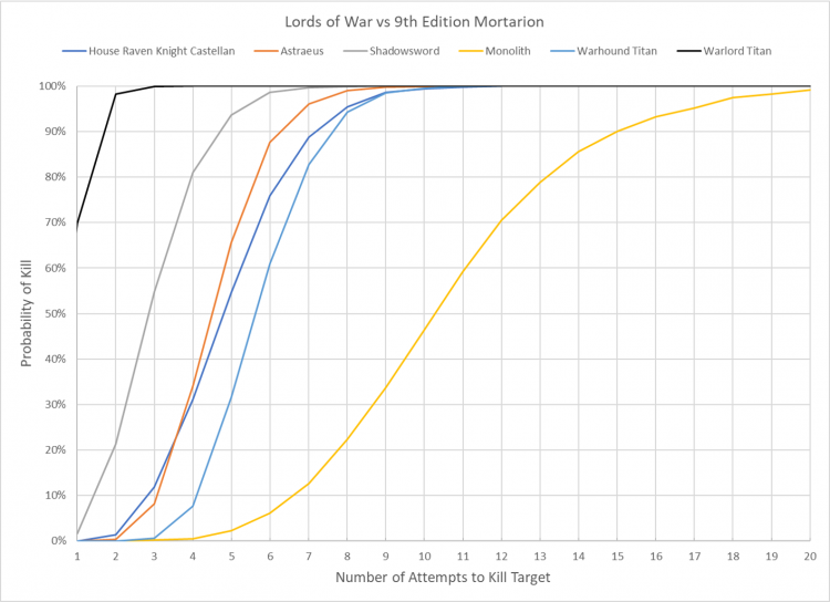 Sadly poor Roboute just isn't up to the task, barely inconveniencing his brother thanks the loss of his re-rolls and the significant penalties imposed on his attacks. At least the other Lords of War have a chance to kill Mortarion in a couple turns, and the Knight Rampager even has a chance of killing him in one turn (especially if it also follows up with