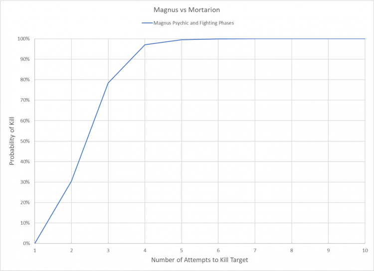 The good news is that Magnus can indeed kill Mortarion in a single turn. The bad news is that it only happened 0.17% of the time. The median number of wounds that Magnus dealt was 7, while the mode (meaning the most common result) was 9 wounds. Although an absolute beast, Magnus needs a lot of rolls to go perfectly in order for the combination to work out while Mortarion can reliably tank nearly everything thanks to his ability to ignore all wounds on a 5+.