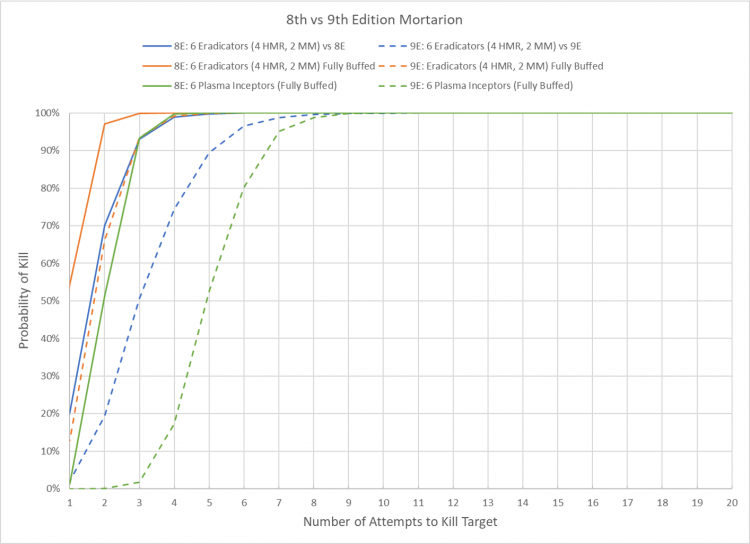 it is now extremely difficult to kill Mortarion in a single round with most units designed for alpha strikes. This is most evident in the fully buffed Eradicator squad, which went from reliably one shotting the 8E version of Mortarion 55% of the time to only being successful 15% of the time. And note that this is the best possible combination, with multiple hit bonuses stacked to overcome the penalty from Mortarion as well as full re-rolls to hit and wound from something like