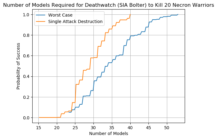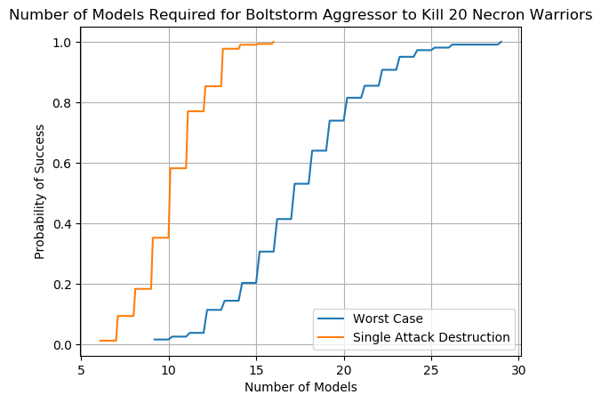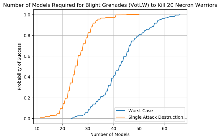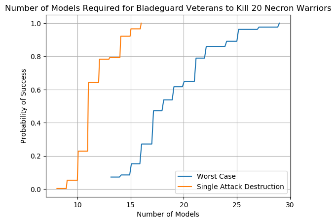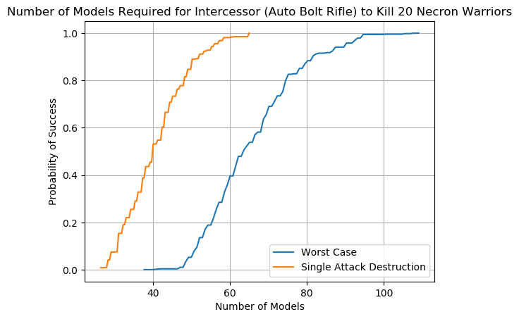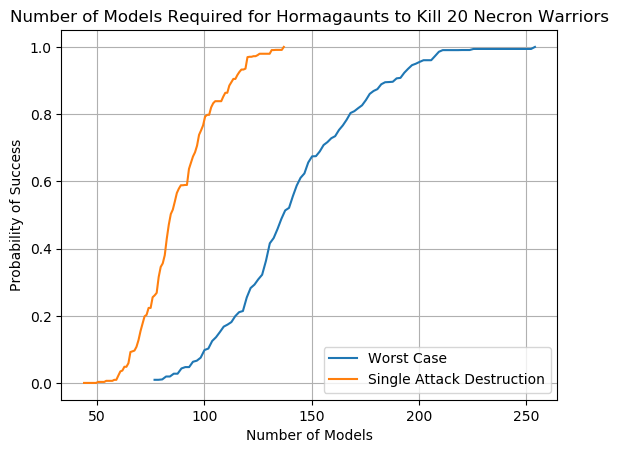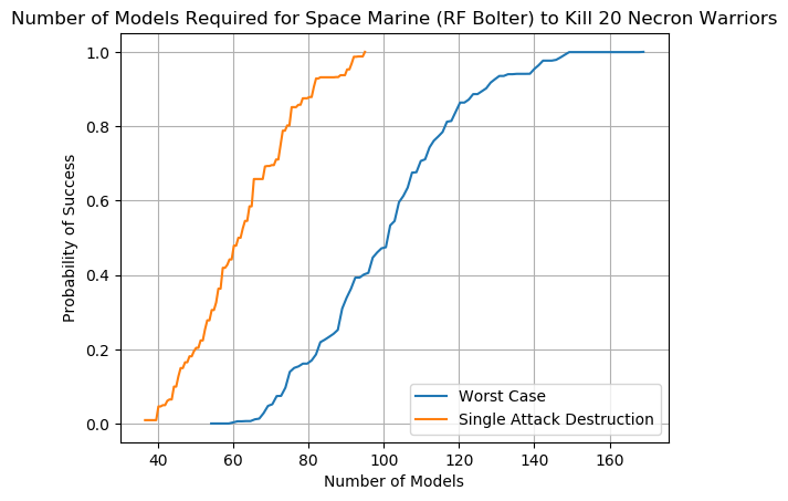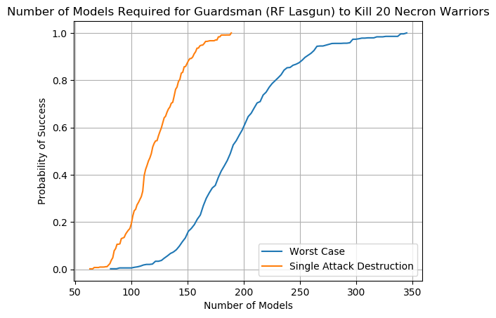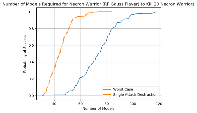 An example chart can be seen below using the lowly Imperial Guardsman. We see from the orange line that there is no possible scenario in which a unit of Guardsman will kill 20 Necron Warriors in a single attack; while having 100 Guardsman fire all at once is a regular Tuesday for the Astra Militarum it doesn't work that way in Warhammer 40,000. The blue line is equally depressing; the worst case scenario requires that 200 Guardsman fire at the incoming Necron Warriors to have a 60% chance of wiping them out. Note that the blue line does not include the possibility of an attacking unit wiping out a partial squad of Necron Warriors, hence why it's the worst case scenario.