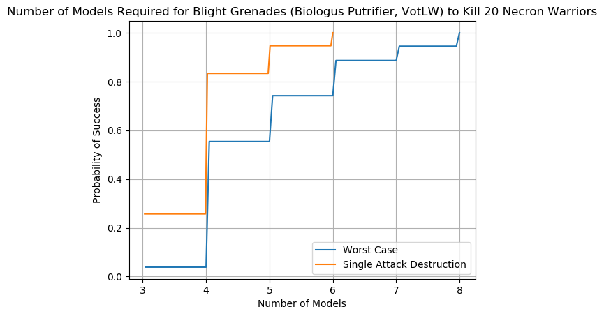 To calculate the graphs below I used a Monte Carlo method where I simulated a million rolls and determined which sequences would result in a dead Necron Warrior. I then used those rolls to determine how many individual attacks were required to kill 20 Necrons (both with and without Resurrection Protocols), and from that I determined how many attacking models were required to achieve that number. Charting those results gave me two curves; one for the best case scenario (every Necron killed in one attack) and the worst case scenario (every Necron slowly whittled down and getting a RP roll after each attack). In the case of blast weapons we use the maximum possible value, which means that over multiple attacks the results would be less effective but it's a price I'm willing to pay for the sake of computational efficiency.