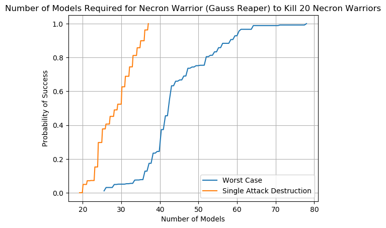 Their Number is Legion are extremely resilient. The way Reanimation Protocols work is that if a unit's attacks does not completely destroy the Necron unit then every wound lost allows the player to roll a d6; every result of 5+ creates a "pool" of wounds that can be used to bring models back. In the case of Necron Warriors with their single wound the effect is basically a super Feel No Pain that ignores excess damage. This also encourages Necron players to field large blocks of Warriors to increase their chances of surviving an attack. With that in mind, exactly how hard are Necron Warriors to kill? In terms of attacks there are two numbers to consider. The first is the probability that a unit's attack will wipe out the block of Warriors, denying them access to RP and guaranteeing they stay dead. The other is the worst case scenario; the maximum number of attacks if the unit is slowly whittled down. By knowing these two numbers we can get a sense of exactly how likely a given unit will be able to destroy the target... eventually.