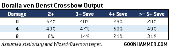 Doralia ven Denst, who happens to wield a crossbow almost as large as she is. When standing still she can fire the crossbow twice at a baseline of 2+ to hit, and given the prevalence of other hit bonuses available to Cities of Sigmar she's likely to be hitting anything she targets 83% of the time. When attacking WIZARD or DAEMON models her damage doubles, giving her the potential to deal as much as 8 points of damage. Against Kroak and his 4+ save that translates to a 10% chance that Doralia can snipe him. That's one hell of a crossbow.