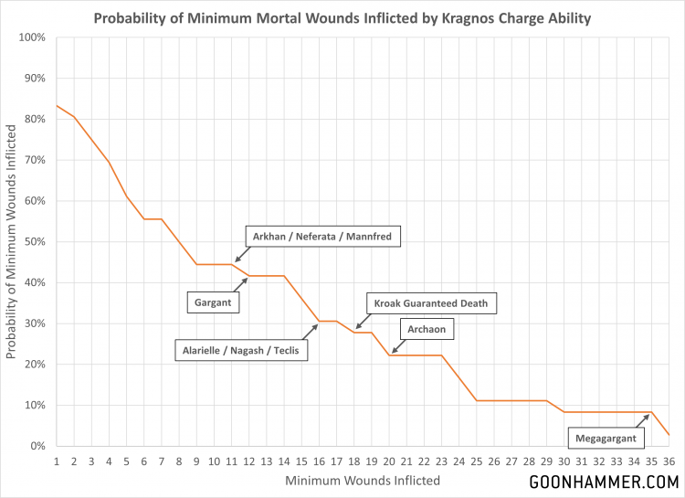 The resulting probability curve is very odd, with several flat regions and drops thanks to the uneven distribution of values that are produced when two numbers are multiplied. Note that the probability of getting a 7 on 2d6 is around 17%, so you could consider this ability to be the equivalent of requiring a 2+ on a D6. But even taking that into account, the sheer amount of damage that Kragnos can produce on the charge is immense. Taking in to account Kroak's variable ability to withstand damage, Kragnos has a 46% chance of killing him on the charge.