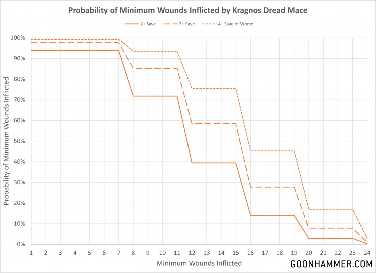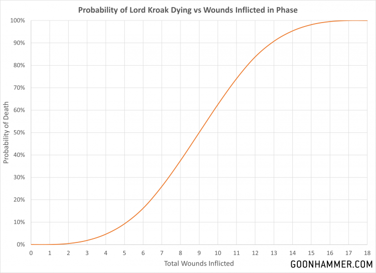 Dead for Innumerable Ages. At the end of each phase, you roll 3D6 and add the number of wounds and mortal wounds that have been allocated to the model. If the total of that roll is greater than or equal to 20, then Kroak is dead. Otherwise all of the wounds are healed. Should Kroak take 18 or more wounds he is immediately slain and removed. The chart below graphs the probabilities relative to the amount of damage inflicted. There's a few interesting things about the results. First, even though the designer notes explicitly call out 18 wounds as the target number; the fact that the target number is 20 or more means that 17 wounds also has a 100% chance of killing him. Second, the balance point for Lord Kroak is actually only 9 wounds, meaning at that point he dies 50% of the time. That doesn't seem like a very large number for a model which costs 430 points, so smart players will still want to make sure Kroak is properly screened.
