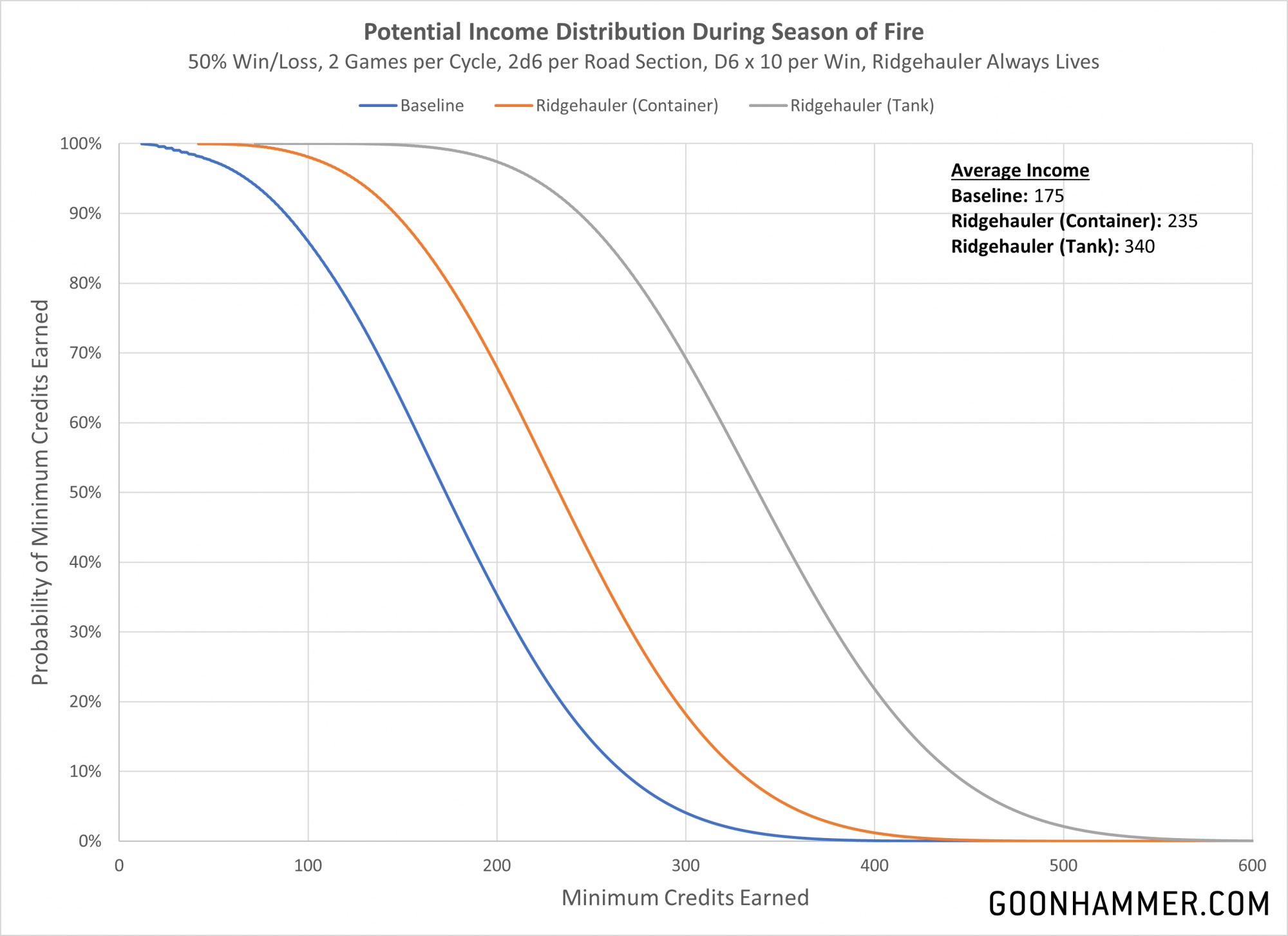 Using a simple AnyDice program we can simulate the distribution of income assuming the player has the above conditions. Each of the "battle" functions in the code represents a week. If they win a game then they get the D6 x 10 prize for winning and the 2d6 revenue from the Road Sections for every week left. The code assumes three weeks of progress, meaning the payout you would get during Downtime (not including the 250 credits everyone gets). The chart below shows the predicted distribution of funds, along with what happens if you take a single Ridgehauler that manages to survive every mission. On average the gang receives 175 credits, while the presence of a Ridgehauler adds on average an additional 60 to 165 depending on what options are chosen and if it survives every match. Adding additional trailers would increase the average by a consistent result based on what was chosen.