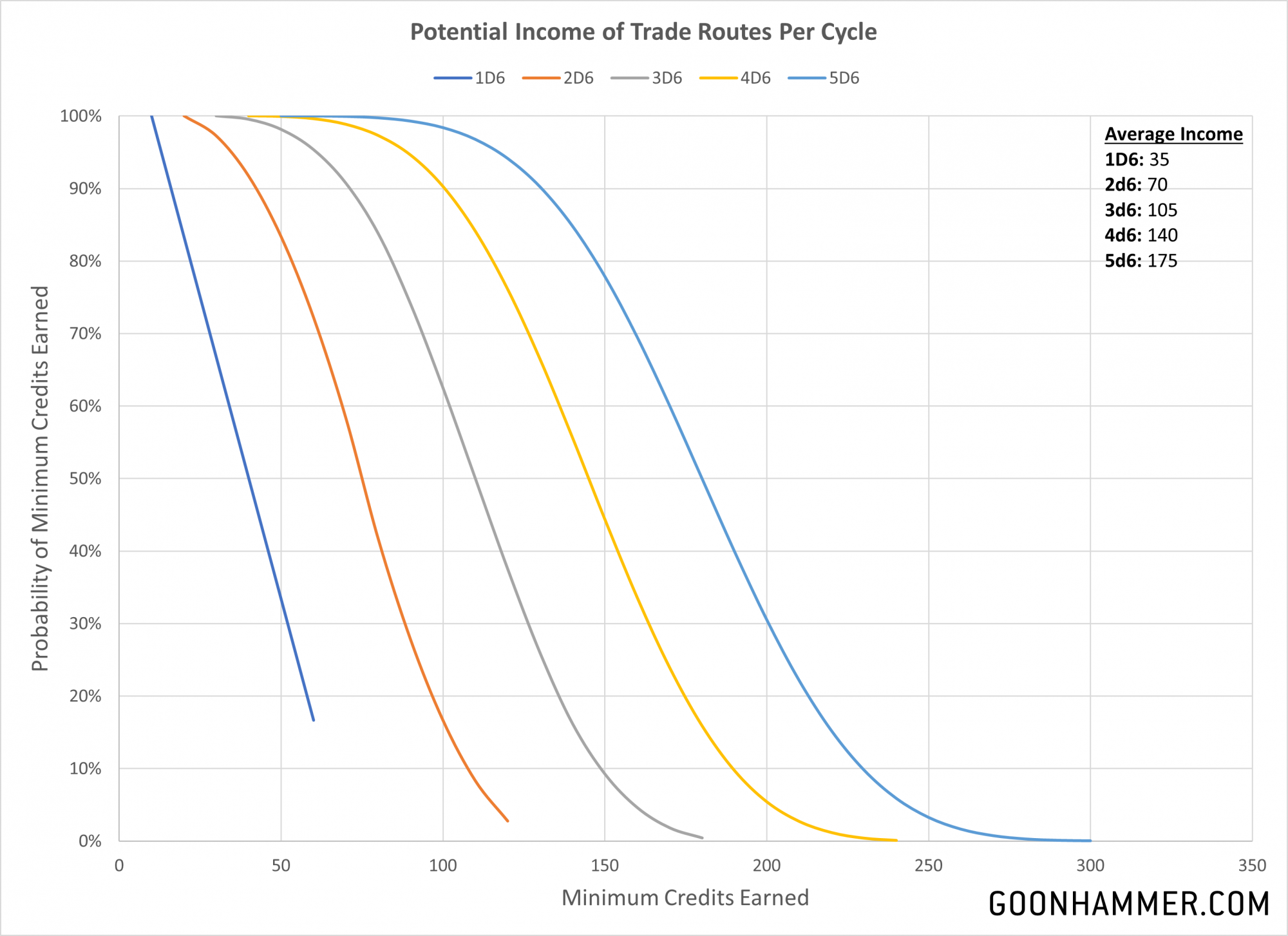 While it's not a perfect representation, it allows us to get at least a sense of how much a gang might expect to make over the course of three cycles assuming they had no Trade Routes. But since that's an integral part of the campaign it's important to explore what that means and how beneficial they can be. The chart below shows the potential income distribution of a Trade Route per cycle. The biggest thing that stands out is how valuable a route like Light's End to Cinderak City is; 5d6 x 10 credits for a Raider if you can control the three Road Sections. Add an additional 70 credits per cycle if you go through Spider Mines and you can quickly see that Trade Routes can dominate income streams.