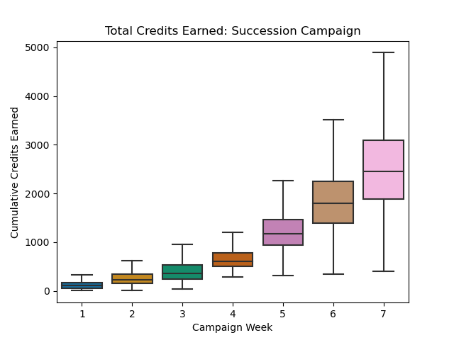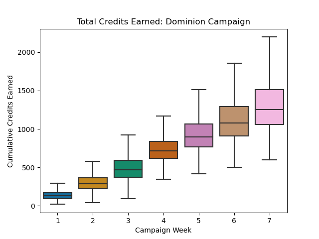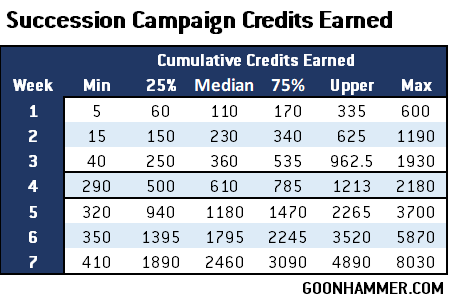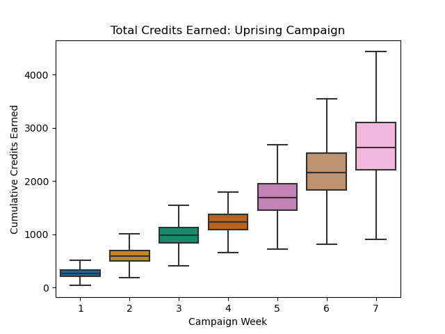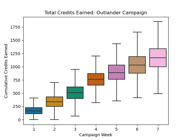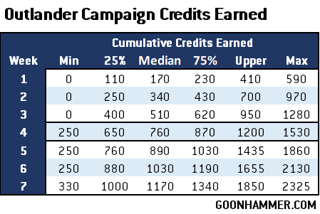 Since I changed the number of missions played per week it made sense to take a second look at the Outlander Campaign. Unsurprisingly adding a second mission shot the values up considerably; the median credits earned after a full campaign was 750 credits assuming one game per week and with two it's at 1170. This shows exactly how much impact having some players with more free time than others can impact a game; if one player is getting three games in per week while another is only getting one then the first player is likely to be much further ahead.