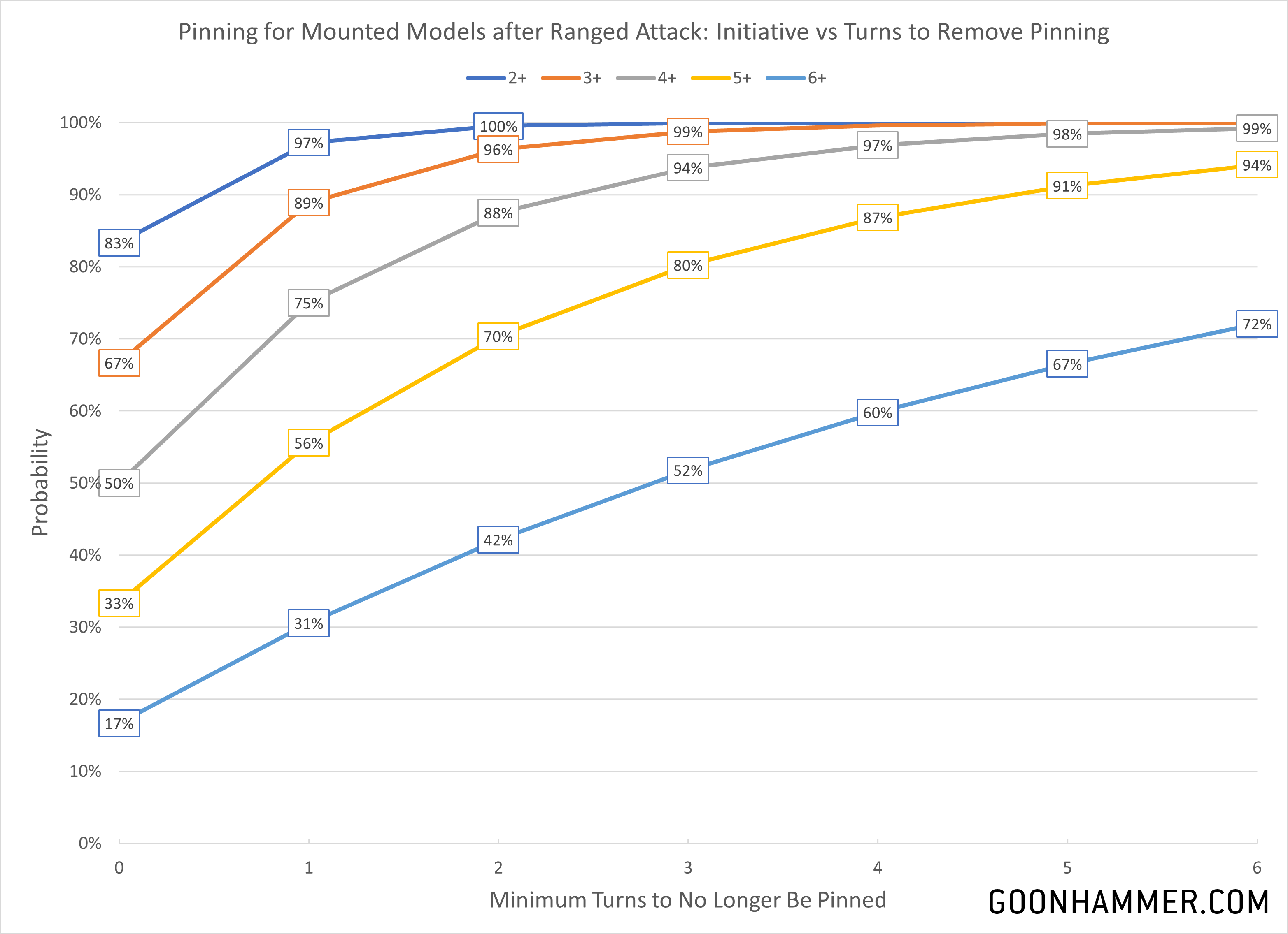 Knockback traits). If they fail the check they take a hit with characteristics based on how far they traveled during their last activation, and then they become Prone and Pinned. But wait, there's more. In order to get back up the model has to pass an Initiative check before they can make a Stand Up (Basic) action. If they fail the check, they action is wasted. And since it's a Basic action, they can't try to get up until the next activation. This can be brutal, as seen in the graph below.
