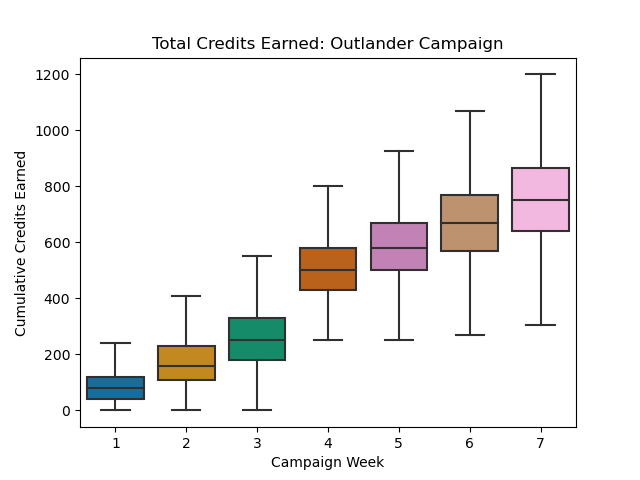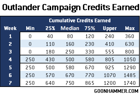 The difference between the "Upper" and "Max" values is that the "Upper" value is a means to exclude outliers which could unnecessarily skew the data. Basically the process is that the distance between the 25% and 75% regions mark the "Inter-Quartile Range" (IQR), and anything that's more than 1.5 IRQ above or below the 25% and 75% lines is excluded as an outlier. In other words from a statistical standpoint it's best to assume that by Week 7 the cap of an Outlander campaign is 1200 credits earned, but one lucky guy out of the million simulated made 1740. That little guy? I wouldn't worry about that little guy.