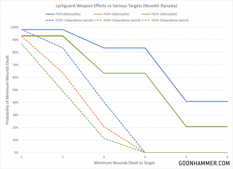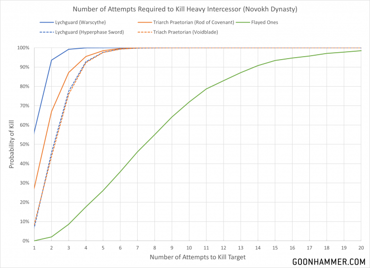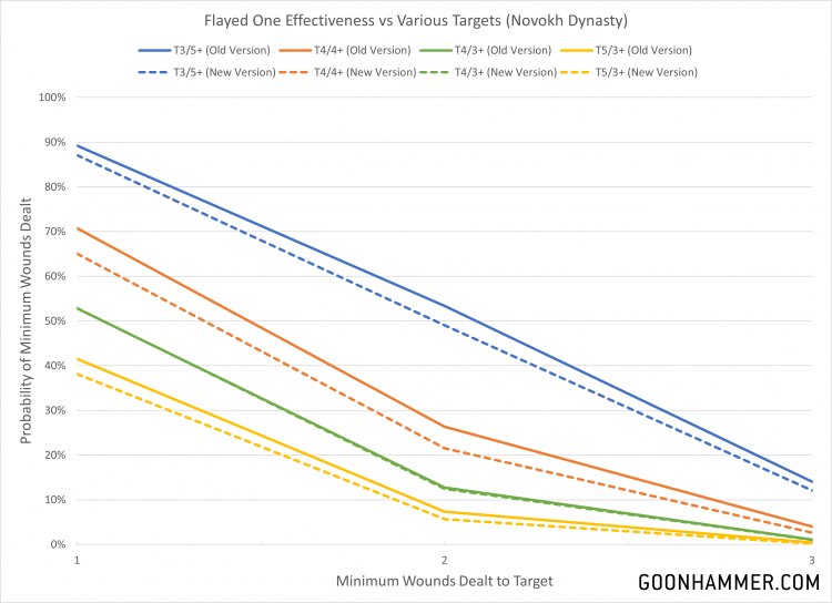 Flayed Ones saw their claws clipped, with the re-roll to wounds changed out for an AP of -1. For Flayed Ones this is a slight nerf, as S4 isn't exactly threatening a lot of targets and AP works best when it's large enough to remove the armour save entirely. The numbers below play that out; against a variety of common targets we see that AP -1 just isn't as effective as re-rolling failed wound rolls, though it's worth noting that the curves for T4/3+ are identical. Perhaps GW specifically chose that as a balance point? It's an interesting case of something that's a clear mathematical nerf but will likely be so negligible that you don't actually feel the impact in most games and you won't see it at all going up against regular power armored T4 marines.