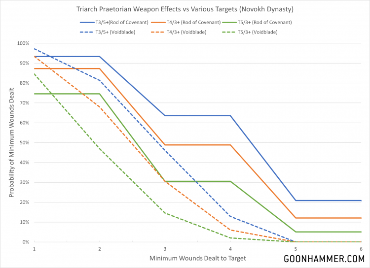 The Triarch Praetorian also received a boost in its Attack characteristic, which when combined with the 10" Movement makes them a fairly terrifying foe to face. Praetorians have the option of either wielding a rod of covenant or a voidblade and particle caster. At range the rod of covenant is strictly better, with the only reason one might want to use a particle caster instead is if they anticipate being stuck in melee. The voidblade is interesting in that it gives Praetorian an extra attack; is that worth the loss of a point of damage? In general the answer seems to be no, especially when you take into consideration the degradation of the ranged attack.