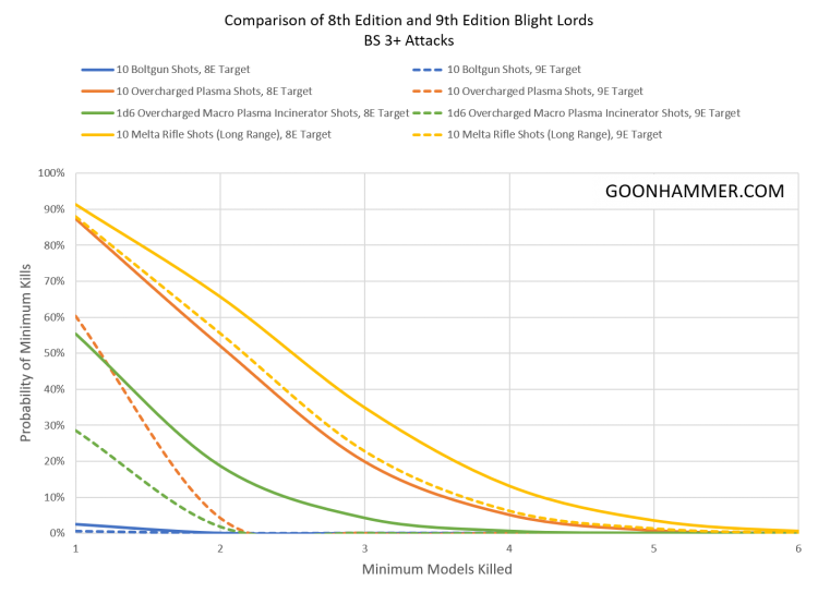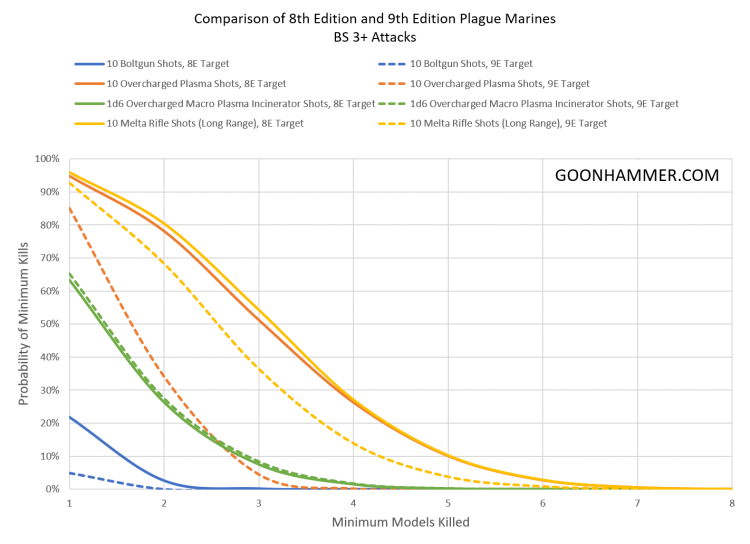It's important to consider the changes to Death Guard in the context of what happened to the rest of the stat line. Both Plague Marines and Blight Lords received an additional wound to put them in line with the rest of the Astartes, which immediately makes them twice as tough. With that in mind, did the new rules make these core units tougher or weaker compared to their legacy versions? The easiest way to examine this is to simulate several attacks using common weapons that have been effective against Astartes in the past. In this case we look at 10 bolter shots, 10 overcharged plasma gun shots, the output of a macro plasma incinerator, and 10 melta rifle shots outside of long range. The charts below show the resulting casualties, and we can immediately see that