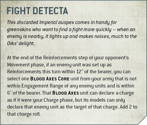 Fight Detecta is the pinnacle of Ork technology, allowing a BLOOD AXE CORE unit to interrupt and charge an enemy that was foolish enough to show up nearby. Adding 2 to the charge roll and getting a re-roll courtesy of