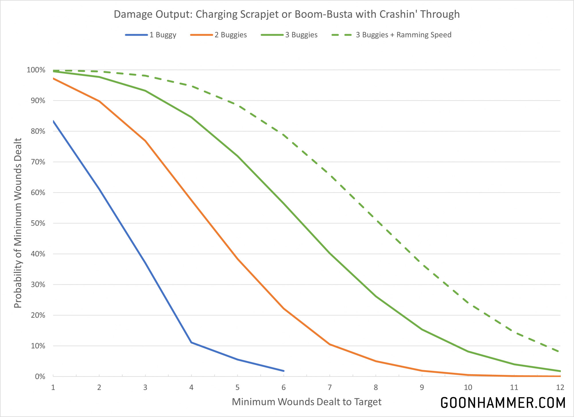 Even for one buggy the results are slightly better than the usual ratio of 1d3 mortal wounds for a CP that GW has previously used. 2 buggies have a 50% chance of inflicting at least 4 mortal wounds and can serve a viable threat to a character, while 3 buggies and