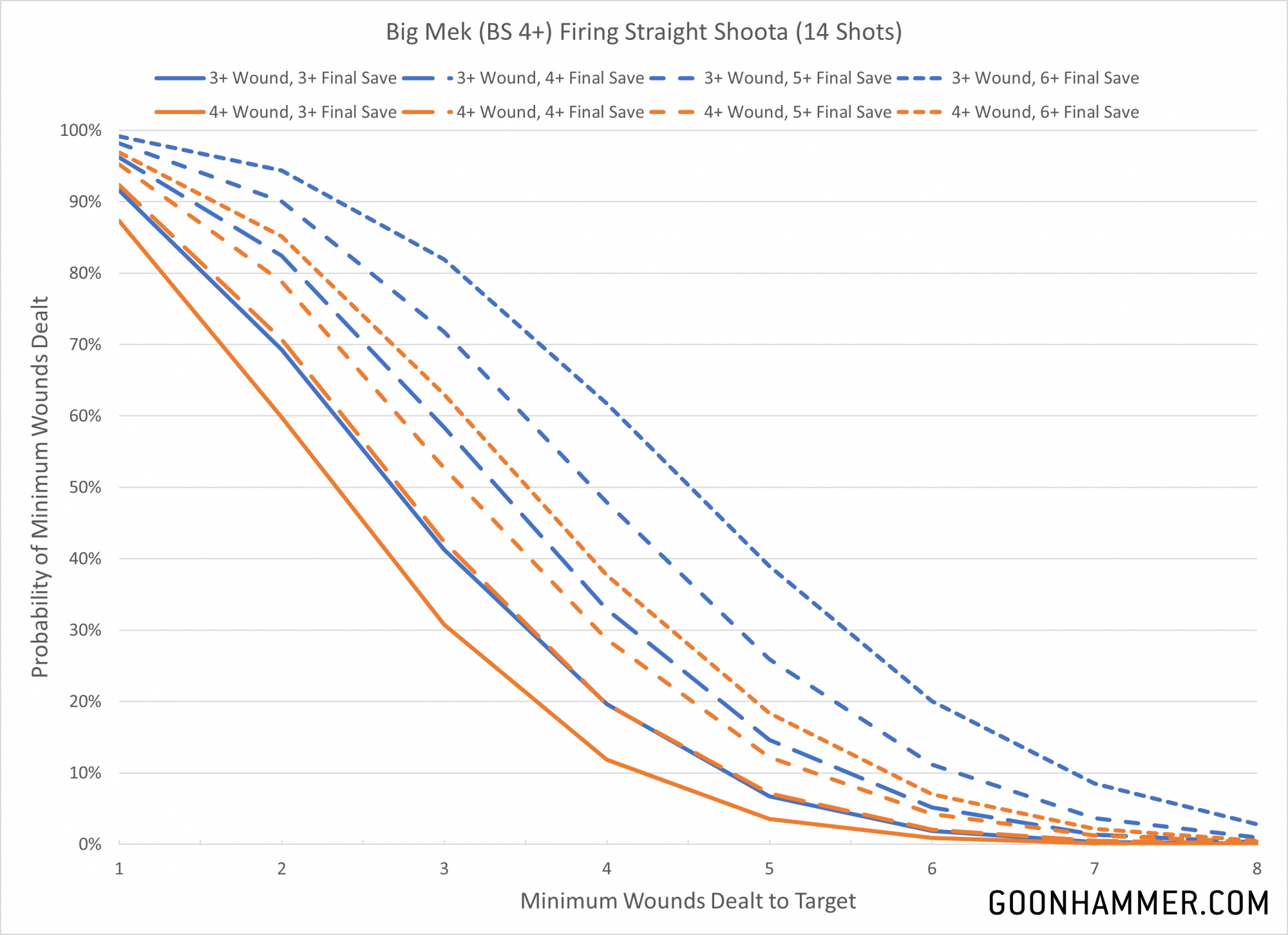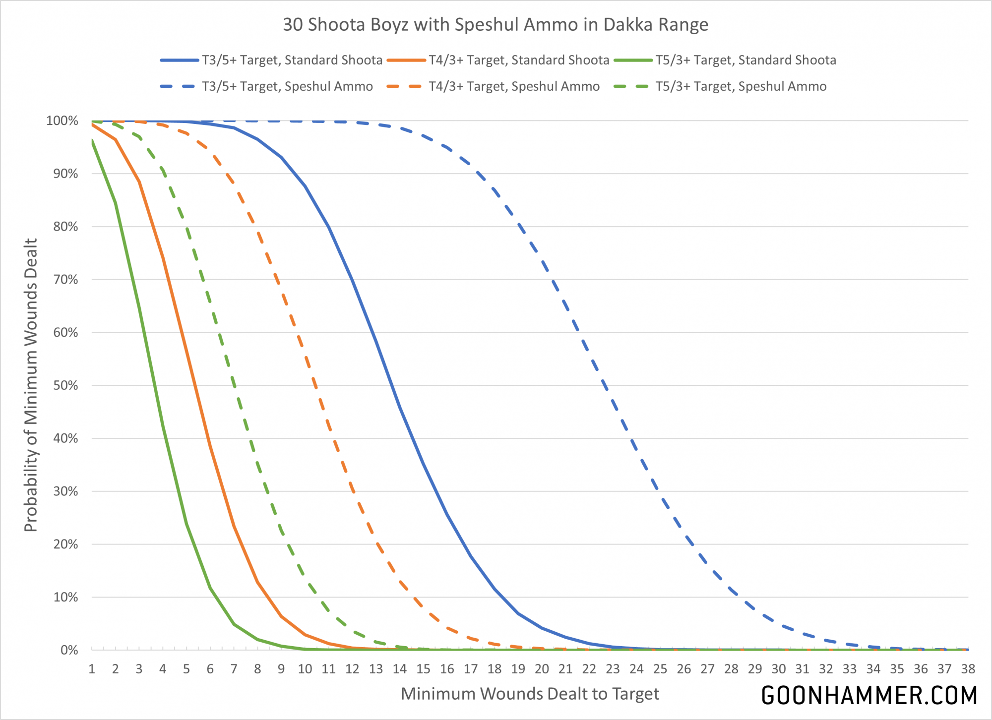 Speshul Ammo to upgrade their shootas to Dakka 4/2 guns with AP -1. Not a bad upgrade from the Dakka 3/2 profile with no AP, especially if you have 30 of them. For this analysis we'll look at three profiles; T3/5+, T4/3+, and T5/3+. If there's a particular target you're interested in the