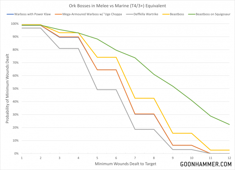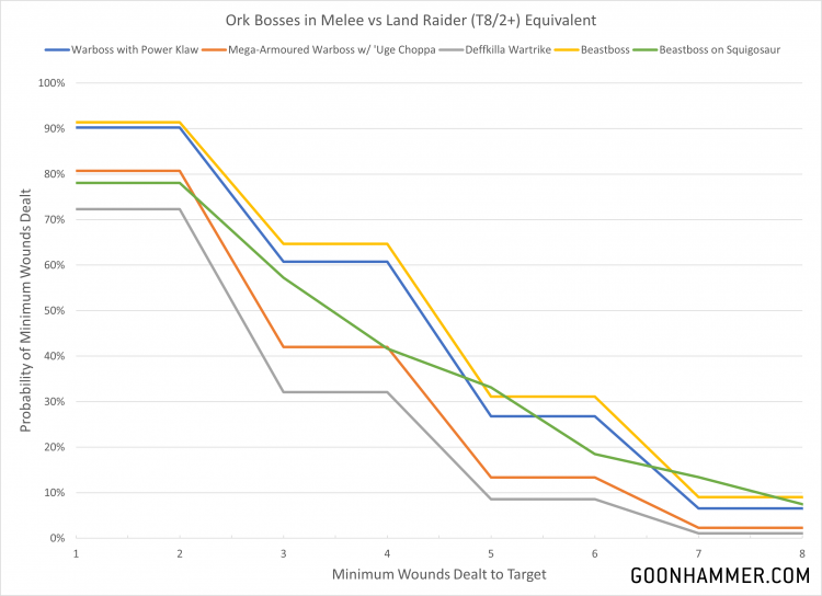 From the charts below we see that on average a Warboss is going to have a good chance of killing at least 3 Primaris Marines and deal a reasonable amount of damage to a light vehicle, but they suffer against heavy targets like a T8/2+ Land Raider. The Beastboss on Squigosaur is particularly good thanks to the extra attacks from the squigosaur. Note that these are just the baseline attacks; so when bonuses from Klan abilities, Warlord Traits, Stratagems, and Relics are added expect even more brutality.