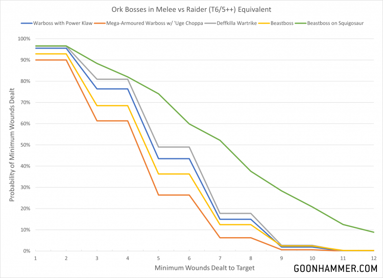 Trout. There's only one problem; there's roughly ten thousand different Ork characters in this book and all of them have different profiles. Want to kill everything? Take Ghaz. Want to eat everything? Take Skragbad. I'll save a deep dive for a future article, but to start I'll compare the Warboss with power klaw, Mega-Armoured Warboss, Deffkilla Wartrike, and Beastboss on Squigosaur against a selection of targets. Ork Warbosses are characterized with a baseline of 5 attacks, typically hitting at S7 to S12 depending on the weapon, hitting on a 2+ and dealing 2 damage behind an AP of -2 or -3. The new Beastboss units come in either a foot unit that hits very similarly to the previous models, or a Beastboss on Squigosaur option which gets an additional 3 attacks which can deal 3 mortal wounds on wound roll of 6.